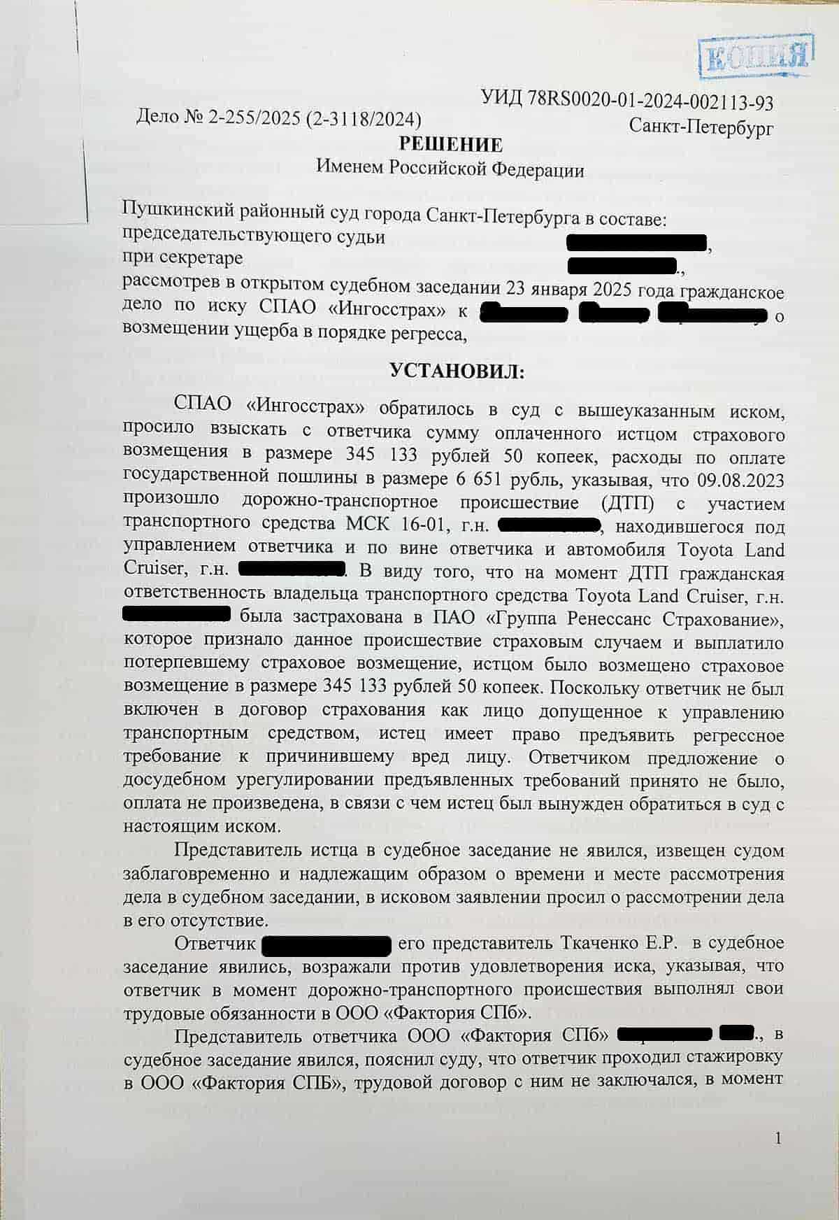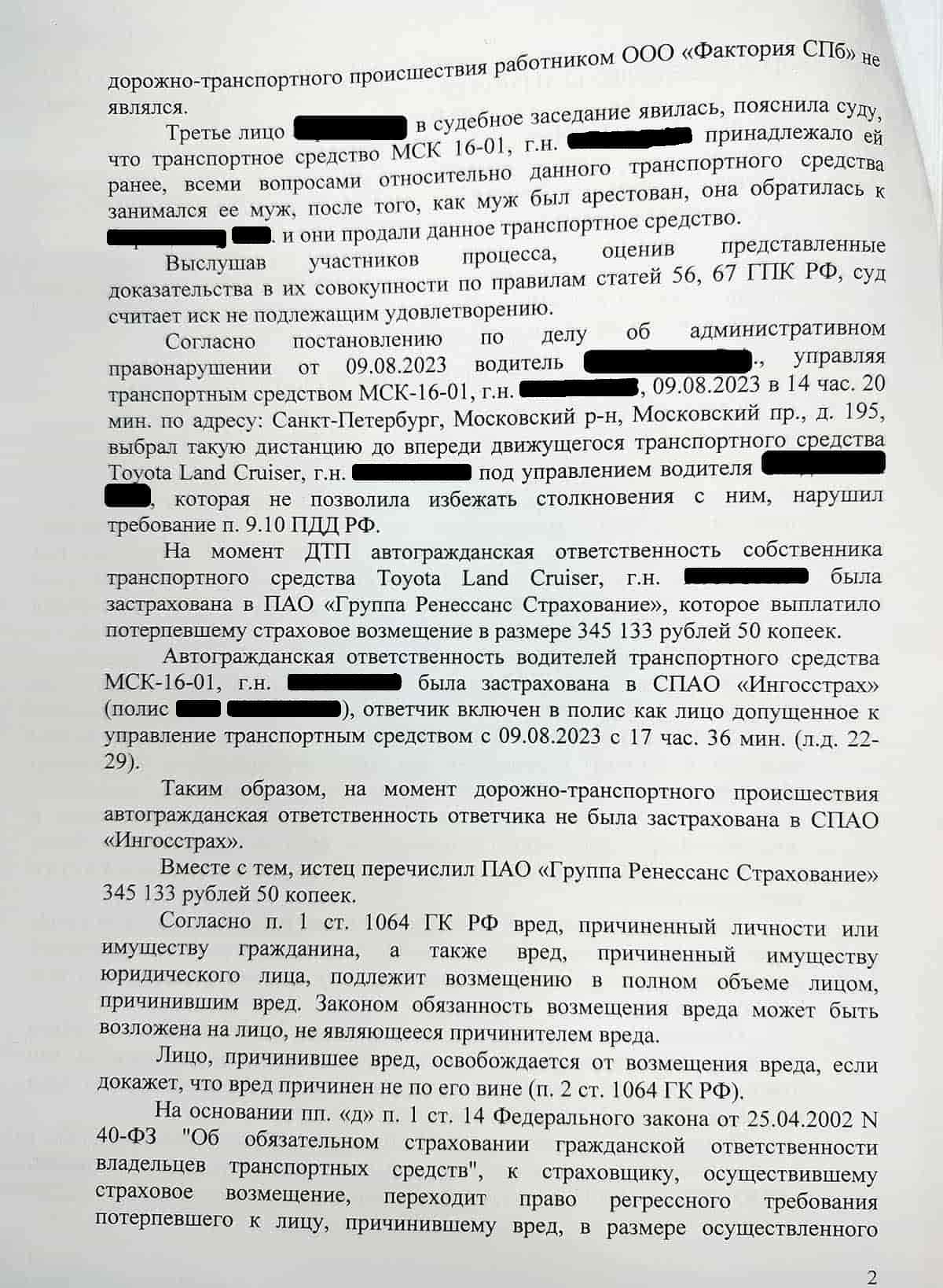 Страховая компания СПАО «Ингосстрах» обратилась в суд с иском о взыскании с водителя (наш клиент, далее Ответчик) суммы выплаченного страхового возмещения в размере 345 133 рублей 50 копеек после ДТП, произошедшего 9 августа 2023 года.